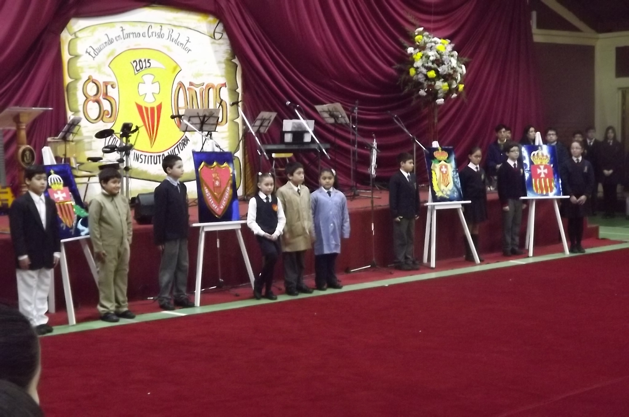 El programa se inició con la entrada de pequeños estudiantes, portando los escudos que ha tenido el colegio en sus 85 años de existencia, mientras se escuchaba el Himno que tuvo el Instituto hasta hace pocos años atrás, el de la “Juventud Vigorosa y Creyente Porvenir de la Patria y la Fe”… y que más tarde se cambió por el que cantan en todo el país sus pares mercedarios.