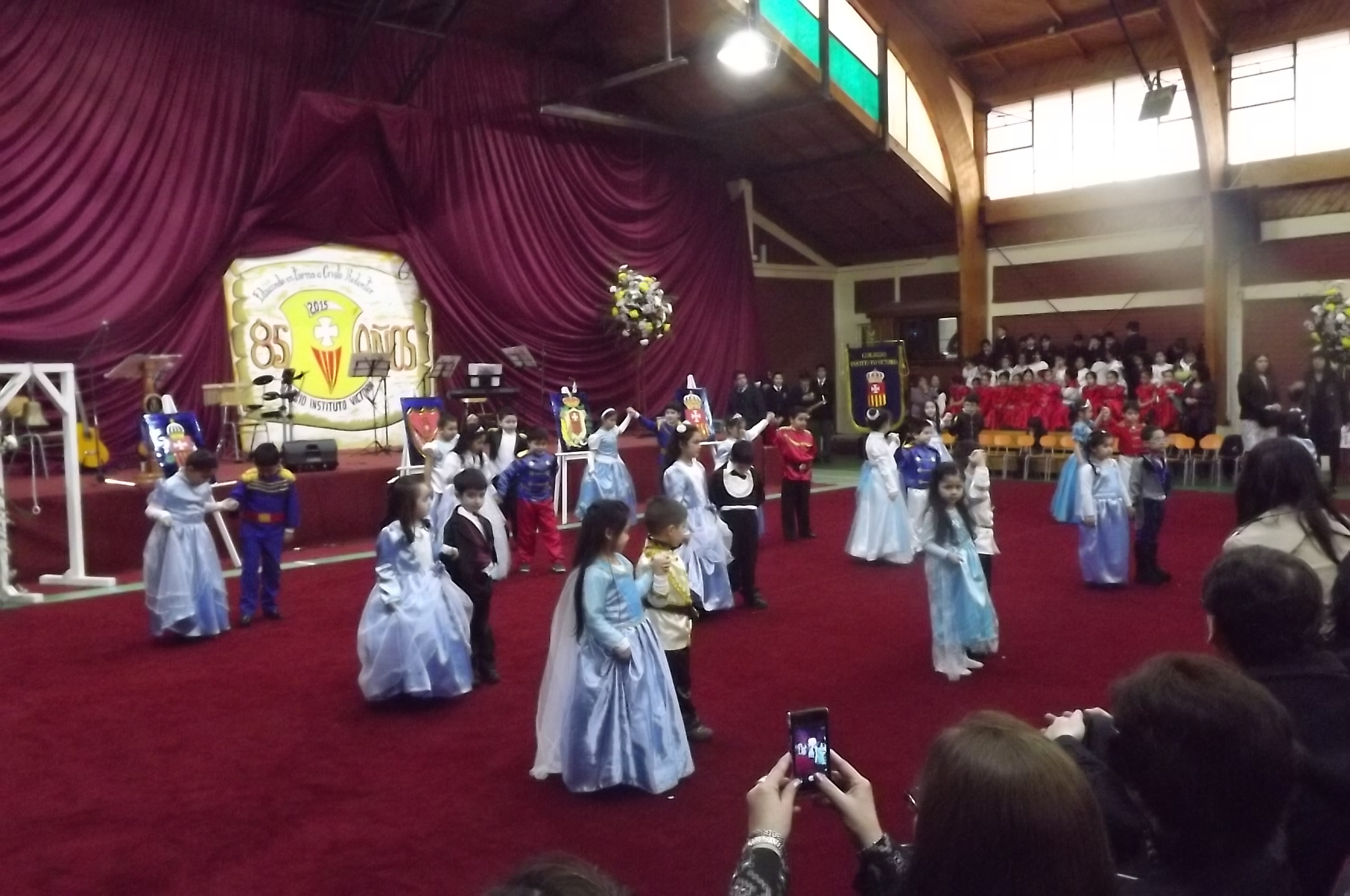 El colegio entregó distinciones a los docentes Lilian Ulloa Cofré y Blas Valenzuela Esparza, por cumplir 20 años de labor profesional en el establecimiento católico y el acto continuó con la presentación del vals Danubio Azul, a cargo de los peques de Pre Básica, y de primer y segundo año, para concluir la emotiva ceremonia con la intervención del Padre Rector.