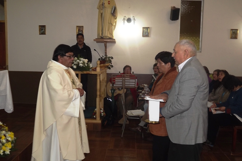 El matrimonio compuesto por Eulogio Santibáñez y María Teresa Quiñenao, llevaron hasta al Altar la ofrendas de Pan y Vino para ser consagradas por el oficiante, en el Cuerpo y la Sangre de Cristo , como Jesús en la Última Cena y que lo consideraron un gran honor.