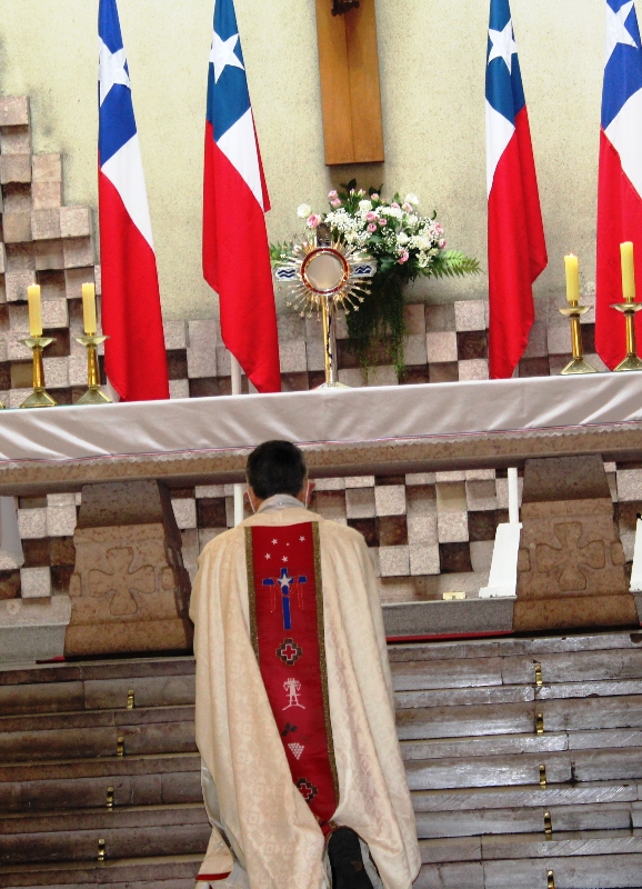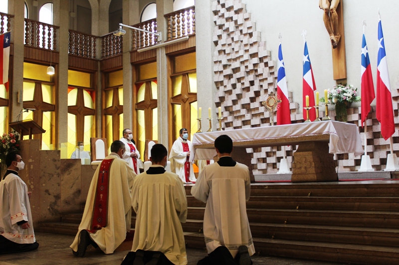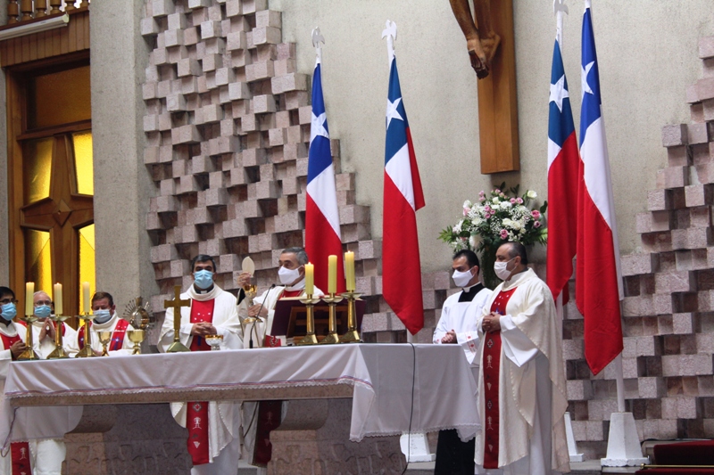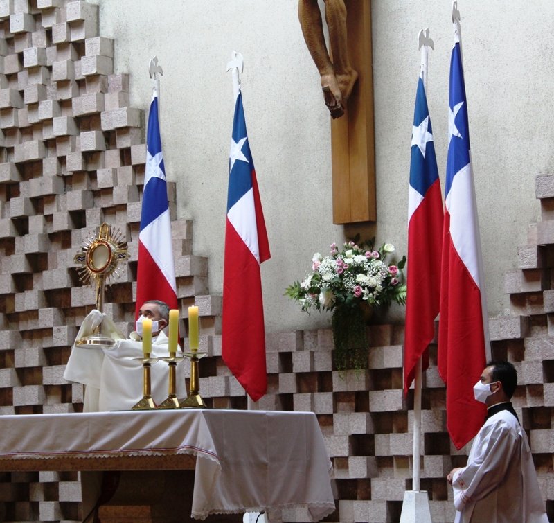 En la bendición Eucarística, se expuso la Custodia de Chile, gesto que invita a la unidad en este día, momento de oración y de profundo recogimiento. Luego, se brinda un homenaje a la Virgen del Carmen, pidiendo su intercesión por nuestra patria e intenciones, instancia de rezo de la oración tradicional a la Virgen del Carmen, donde nuestro obispo, sacerdotes, diáconos, religiosas, representantes de los decanatos, vicarias, colegios, tomaron en sus manos cintas tricolor que fueron desplegadas de su imagen.