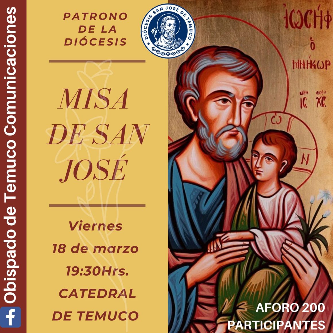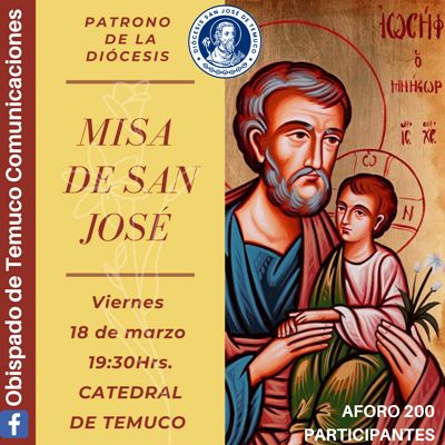 Con motivo de la celebración de la Fiesta Patronal de la Diócesis, se invita a participar en la Santa Misa de San José, el viernes 18 de marzo, a las 19:30 horas, en el Templo Catedral de la ciudad de Temuco.