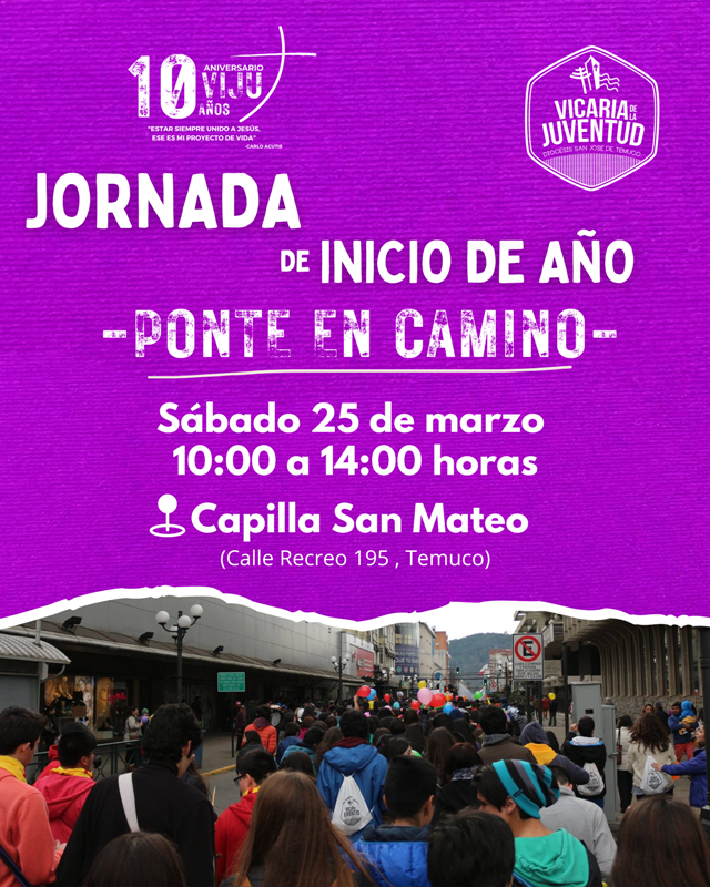 El sábado 25 de marzo, a partir de las 10 horas en dependencias de la Capilla San Mateo (Recreo 195, Temuco) perteneciente a la Parroquia Del Espíritu Santo, Temuco, se realiza la Jornada de Inicio de Año Pastoral que convoca la Vicaria de la Juventud.